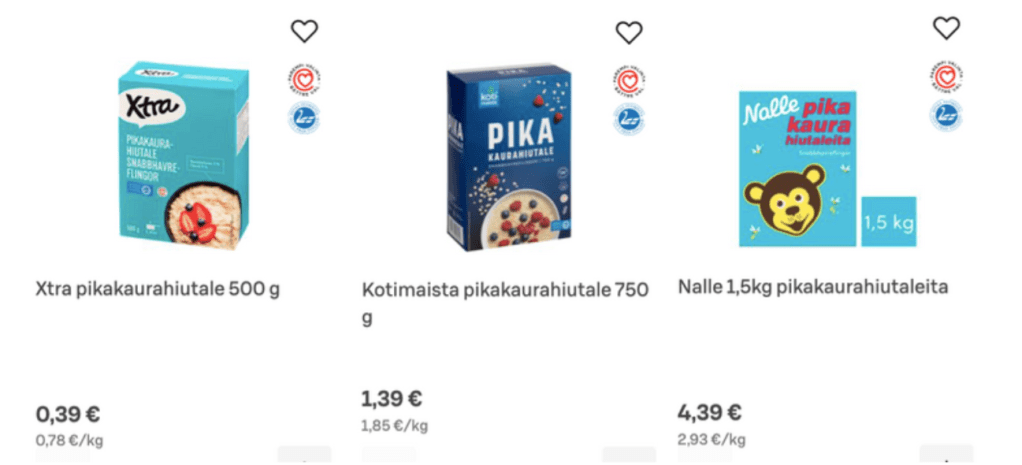 Edullisimmat Xtra:n pikakaurahiutaleet maksavat 0,78€/kg. Seuraava kotimaista-tuotesarjan samat pikakaurahiutaleet ovat jo yli puolet kalliimpia. Nalle-brändin hiutaleet taas ovat jo lähes 3€/kg. Kaikkien näiden hiutaleiden alkuperämaa on Suomi ja ainoa ainesosa on suomalainen täysjyväkaura. (Hinnat s-ryhmän sivuilta, tammikuu 2024)