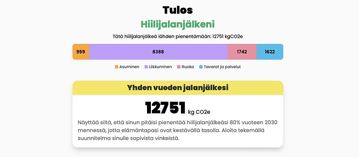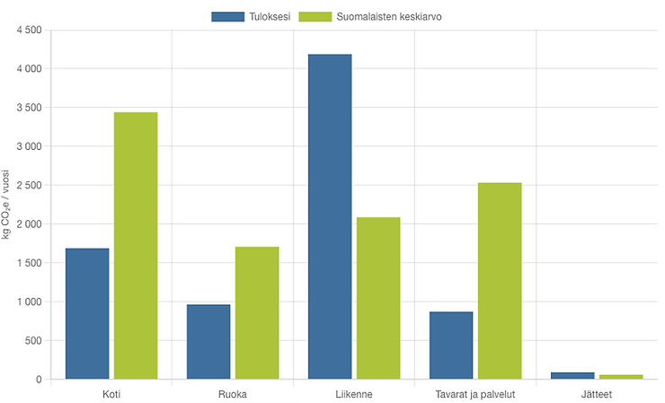 ilmastodieetti.fi -laskurilla olen esimerkillinen kuluttaja kaikilla osa-alueilla paitsi liikenteen osalta. Tulokseni oli 7 800 kg CO2e joka vastaa tavallista suomalaista ylikuluttajaa.