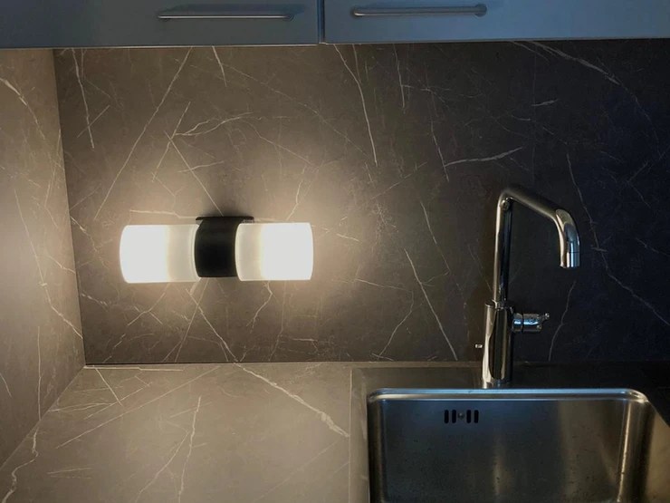Laattatarrat ja valkoiset 15×15 kaakelit jäivät alle ja ne korvattiin kivipintaa jäljittelevällä yhtenäisellä välitilalevyllä. Jouduimme tosin vaihtamaan alkuperäisen suunnitelman mukaisen tason ja välitilalevyn, sillä kesäkuussa tilaamaamme tuotetta ei vielä elokuussakaan ollut saapunut.