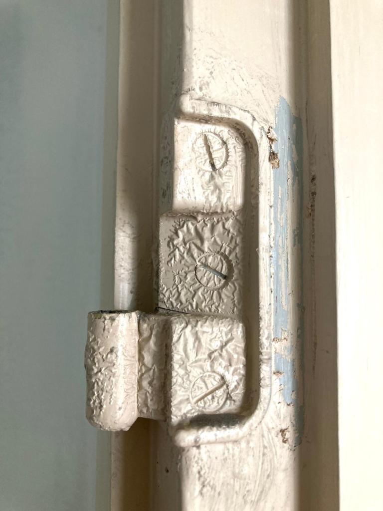Näitä ovia oli maalattu aikaisemminkin ja päättelimme, että saranat eivät olisi enää toimineet mikäli päälle olisi lätkäisty vielä uusi maalipinta vanhojen päälle. Päätimme poistaa maalin maalinpoistoaineella ja kun aine oli kaikissa ovissa ja karmeissa totesimme, että se oli iso virhe. Tehokas hiominen olisi ollut myös metalliosille riittävä ja huomattavasti helpompi ratkaisu, tahmaisen myrkyn raapimisen sijasta.