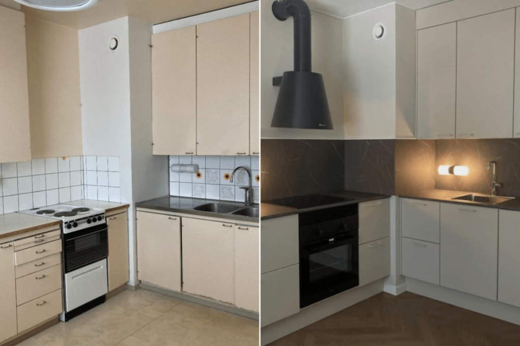 Seuraavana edessä oli kodinkoneiden asennus, joista eniten päänvaivaa tuotti valitsemamme liesituuletin. Kyseessä oli täysin tuntematon merkki, jonka vajavaisten ohjeiden ja hankalan muodon vuoksi asentamisvaiheessa naapuri saattoi kuulla seinän läpi muutaman ruman sanan. Lopputulos oli kuitenkin vaivan arvoinen ja sopi hyvin kiettiön modernisoituun retro-tyyliin.