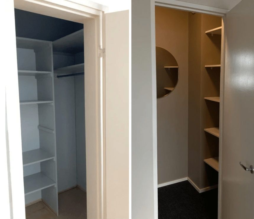 Asunnossa oli kaksi vaatehuonetta, jotka saivat kumpikin uudeet hyllyt ja vaatetangot. Toiseen asensimme pyöreän peilin ja toiseen suuremman noin 2m x 1,5m kokovartalopeilin. Kalanruotolattian sijaan kumpaankin vaatehuoneeseen tuli kokolattiamatto, joka ainakin omaan silmääni tekee vaatehuoneesta enemmän huoneen oloisen, eikä pelkän vaatekaapin.