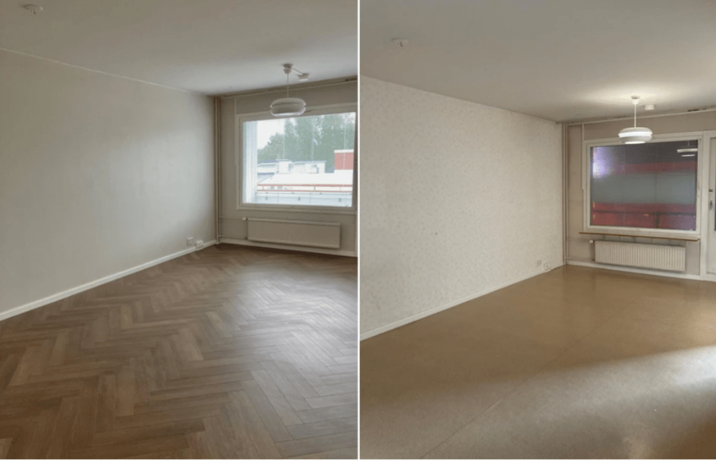 Kalanruotolattista tuli upea isossa olohuoneessa! Sisustin asuntoa mielessäni koko remontin ajan ja voin vain kuvitella kuinka kiva tästä tilasta tulee kalustettuna.