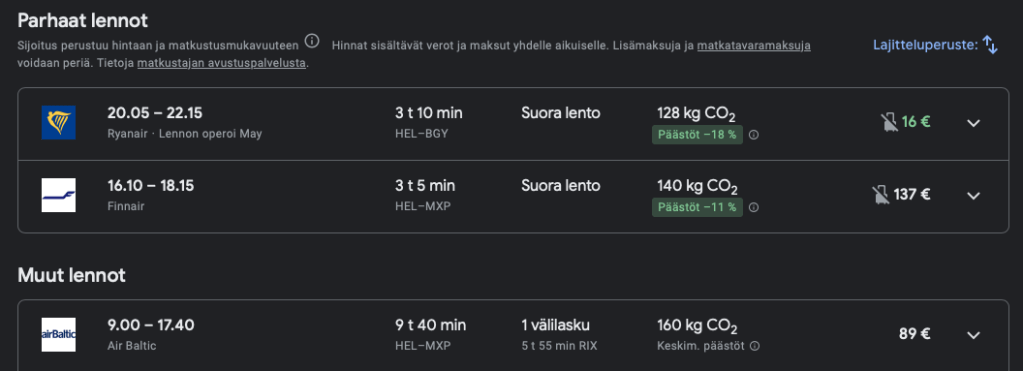 Vielä vuosi sitten Helsingistäkin lähti useampia noin 10€ lentoja Eurooppaan kyseisillä yhtiöillä, mutta tälle syksylle niitä ei näyttänyt olevan lainkaan. Helsinki-Milano välin taittaa kuitenkin yhä kohtuulliseen 15€ hintaan ja esimerkiksi Venetsiasta Palermoon 9€ hintaan.