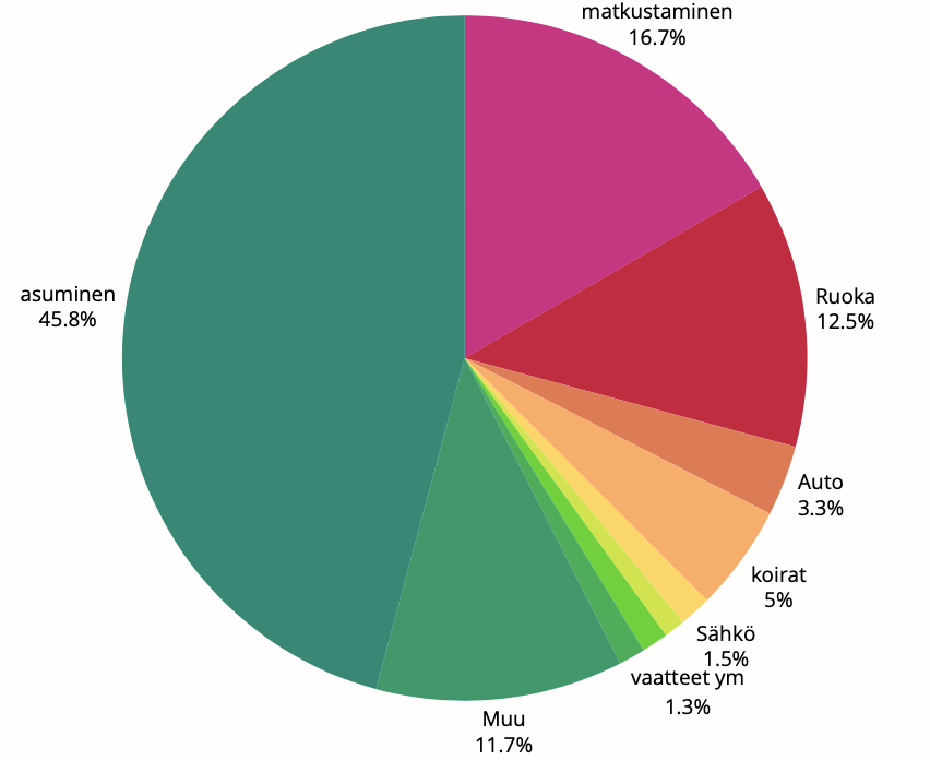 Tulin siihen tulokseen, että näillä kulutusvalinnoilla tuo on se mitä elämiseni maksaa. Tässä tietysti pieni disclaimer siitä, että mitään suurempia yllätyksiä ei ole huomioitu. Kirjoitushetkellä toinen koirista raapii epäilyttävästi toista korvaansa, joten heitin lukuihin suosiolla yhden ylimääräisen korvatulehduksen. Myös verotuspäätös saattaa joko lisätä menoja tai tuloja muutamalla tuhannella.